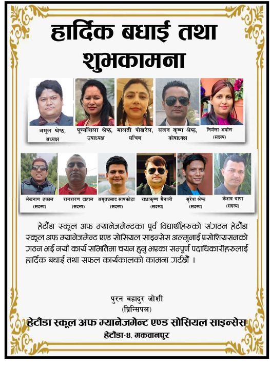 Hetauda School of Management and Social Sciences takes pride in initiating its Alumni Association, with decade’s long record of great deal of iconic students passing out, their pursuing education at institutions of excellence across the globe and many of them being well placed. It is the matter of great proud that the HSMSS Alumni vows to provide them with a forum for interaction. I hereby firmly believe that HSMSS Alumni association will construct the inclusive platform for rich and diversified interaction with those who share values that are abundantly endowed from their formative years. We are proud to acknowledge the numerous successful students who have made a mark for themselves in the world and are delighted to invite all the alumni to come and share their success stories and network with their friends through this forum. Many an institution is known by the strength of the alumni network; we invite you to participate and embrace this opportunity and make us even more proud of you all.